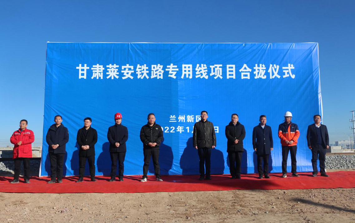 2022年1月19日上午10時,在化工物流園貨場舉行甘肅萊安鐵路專用線項目合攏儀式。蘭州新區(qū)石化集團總經(jīng)理姜錦、蘭州新區(qū)商投集團總經(jīng)理王堅民及中鐵二十一局、甘肅萊安能源有限公司領導出席儀式。