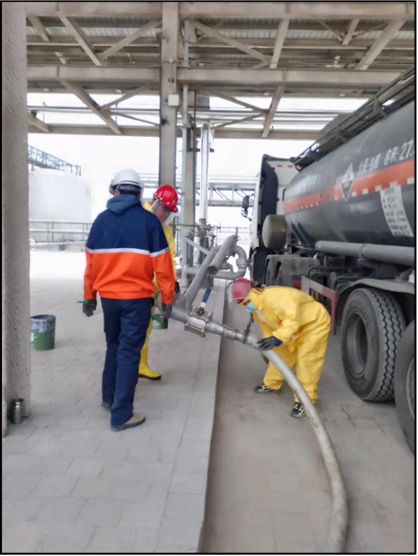 正式作業(yè)前,項(xiàng)目各班組人員對(duì)汽車輸送泵、堿液罐區(qū)氣動(dòng)調(diào)節(jié)閥等進(jìn)行檢測(cè)試驗(yàn),對(duì)工藝流程中法蘭、管道等進(jìn)行周密檢查,多次確認(rèn)。各專業(yè)人員緊密配合,協(xié)同工作,為堿液順利進(jìn)料做好充分準(zhǔn)備工作。隨著裝滿堿液的罐車緩緩駛?cè)胛锪鲌@貨場(chǎng)裝卸棧臺(tái),班組各崗位人員認(rèn)真落實(shí)安全措施,嚴(yán)格按照操作流程進(jìn)行進(jìn)料作業(yè),堿液儲(chǔ)罐順利完成首次進(jìn)料。