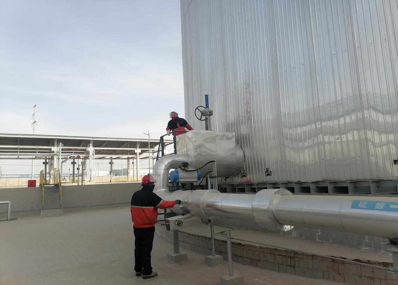 大年初一,接班后班組巡檢人員按照巡檢路線來到了硫酸罐區(qū)進(jìn)行檢查,查看儲罐溫度、壓力、現(xiàn)場管線、閥門的狀態(tài)。數(shù)九寒天、滴水成冰,但絲毫不影響他們的工作熱情,他們嚴(yán)格按照巡檢規(guī)程操作,從裝卸棧臺到罐區(qū),從換熱站到倉庫,都留下了他們忙碌的身影。